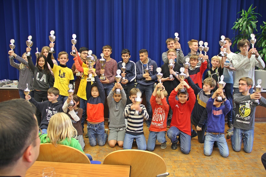 Saal der VHS aufgebauten 33 Pokale – es wurden neben den drei Gesamtsiegern